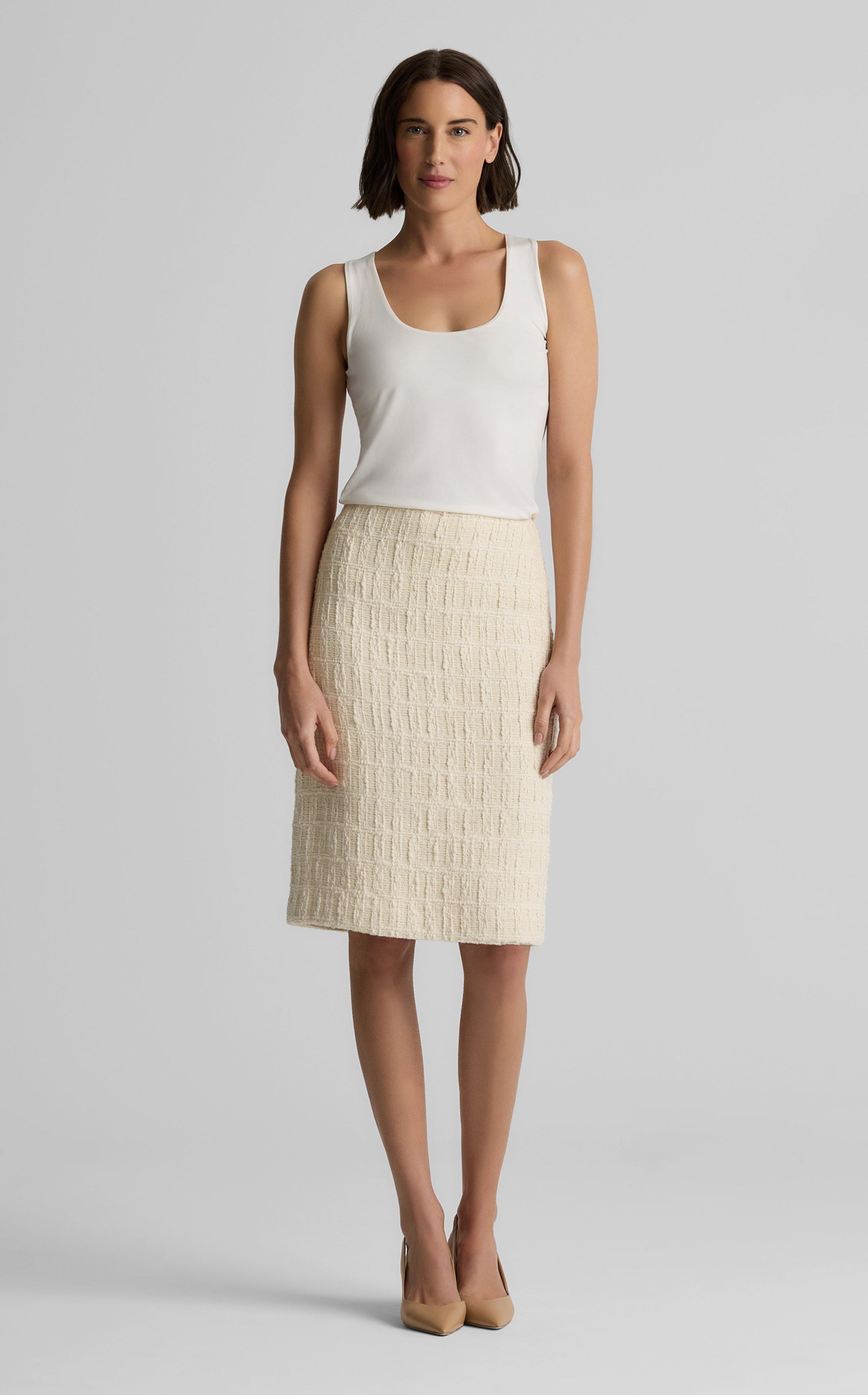 Whether worn with our matching Jordan Jacket or paired with a breadth of blouses and blazers, the Skyler Skirt in our textured Astoria Tweed instantly uplifts the modern woman’s wardrobe. Its tailored silhouette follows your curves while the below-the-knee length adds refinement to daytime or evening ensembles.