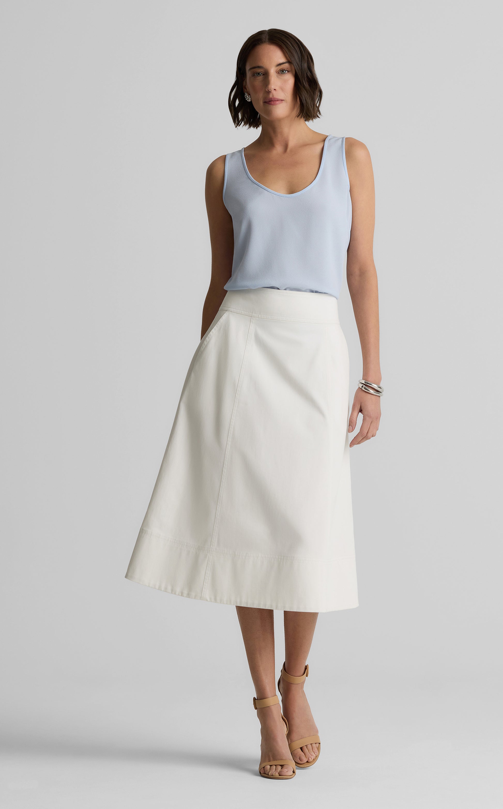 Made from matte stretch satin to move gracefully throughout the day while keeping its soft shape, the Bristol skirt features an A-line shape and slant front pockets for a flattering fit and comfortable wear day or night.