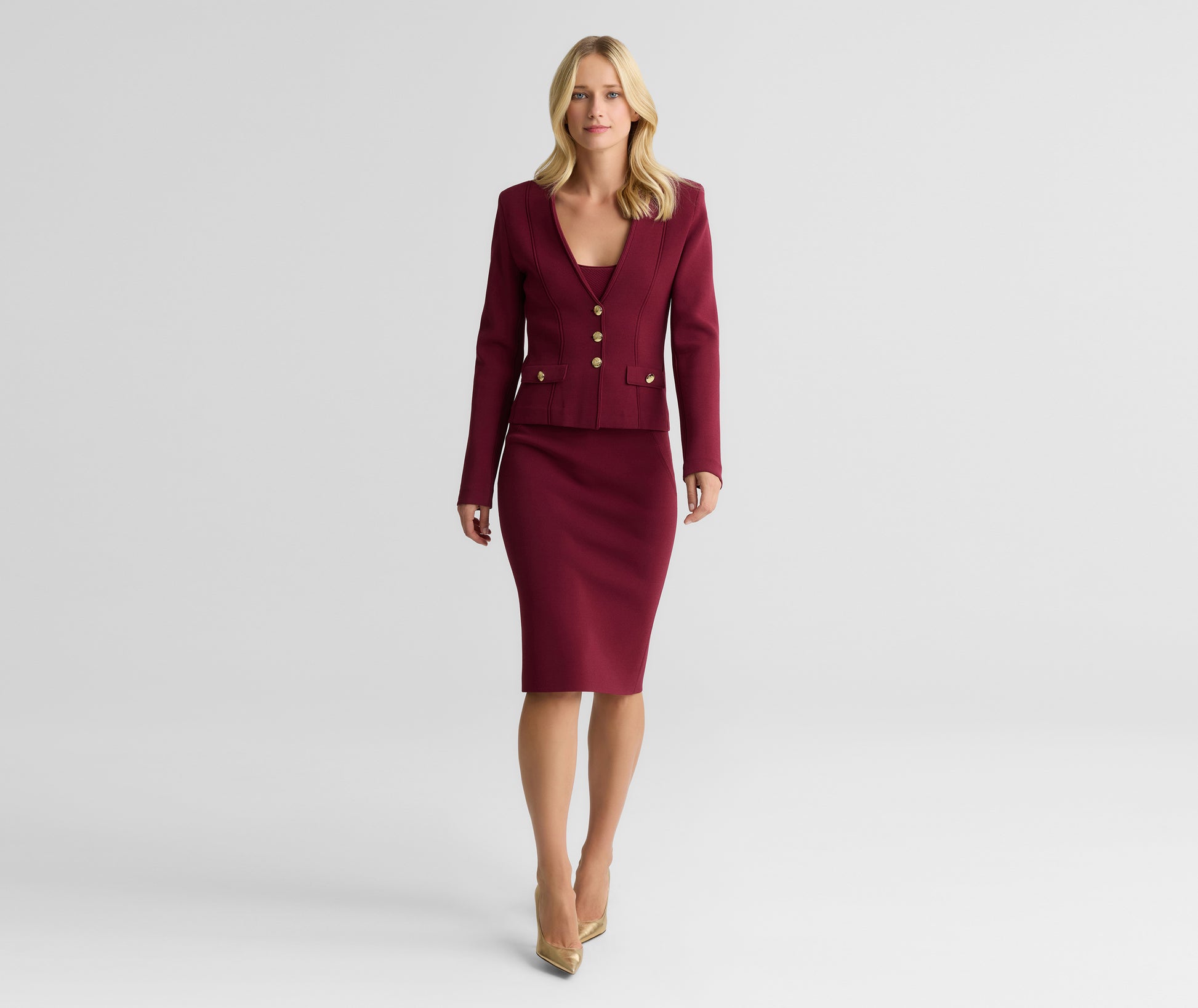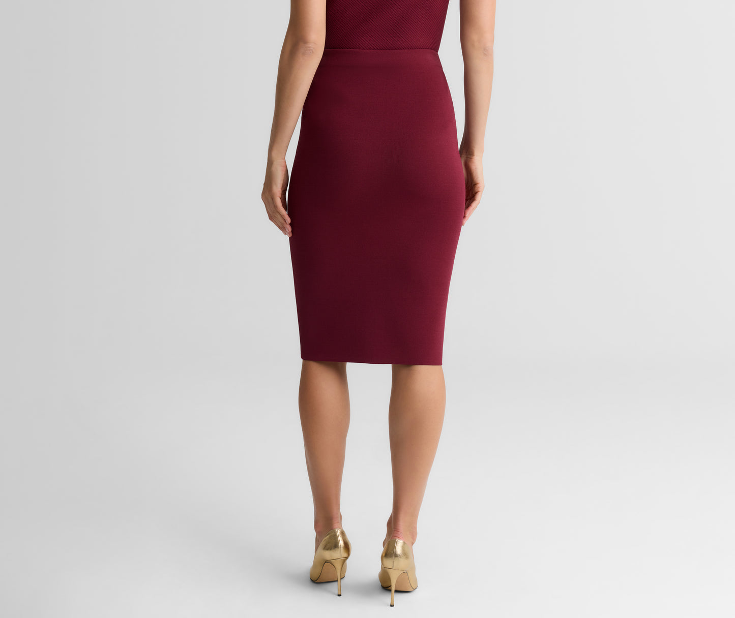For elegance that takes you effortlessly throughout the day, the Nina always delivers. Crafted in our signature Santa Roma Knit in rich Bordeaux, this sleek pencil skirt comfortably forms to the body for a flattering fit and ease of movement. Pair with the Kay Jacket for a refined take on workwear.
