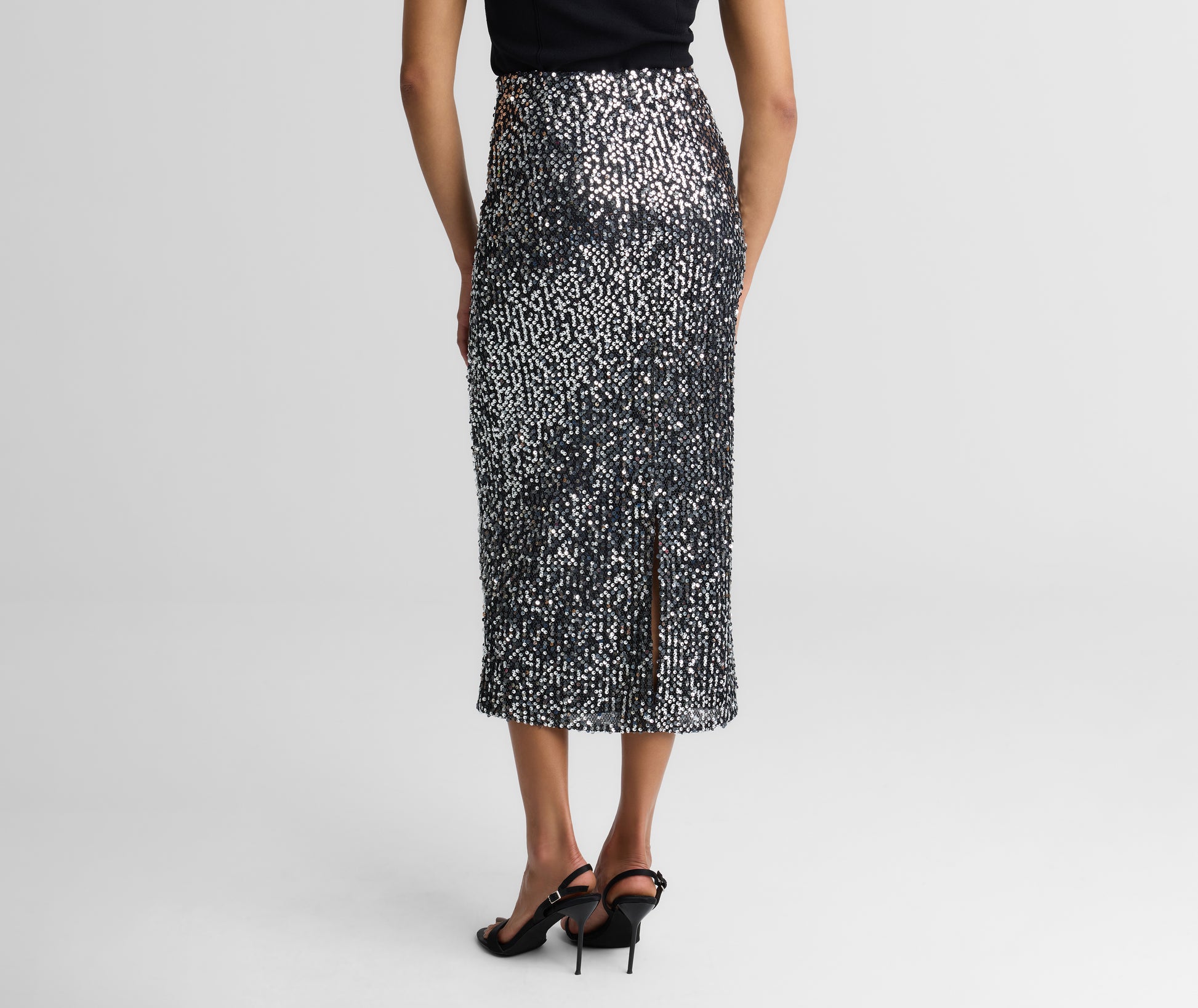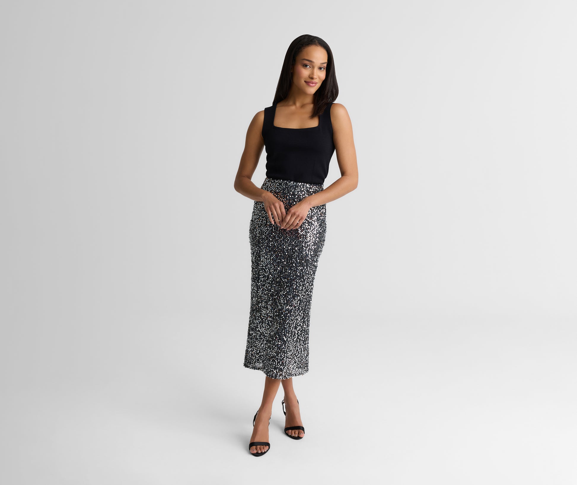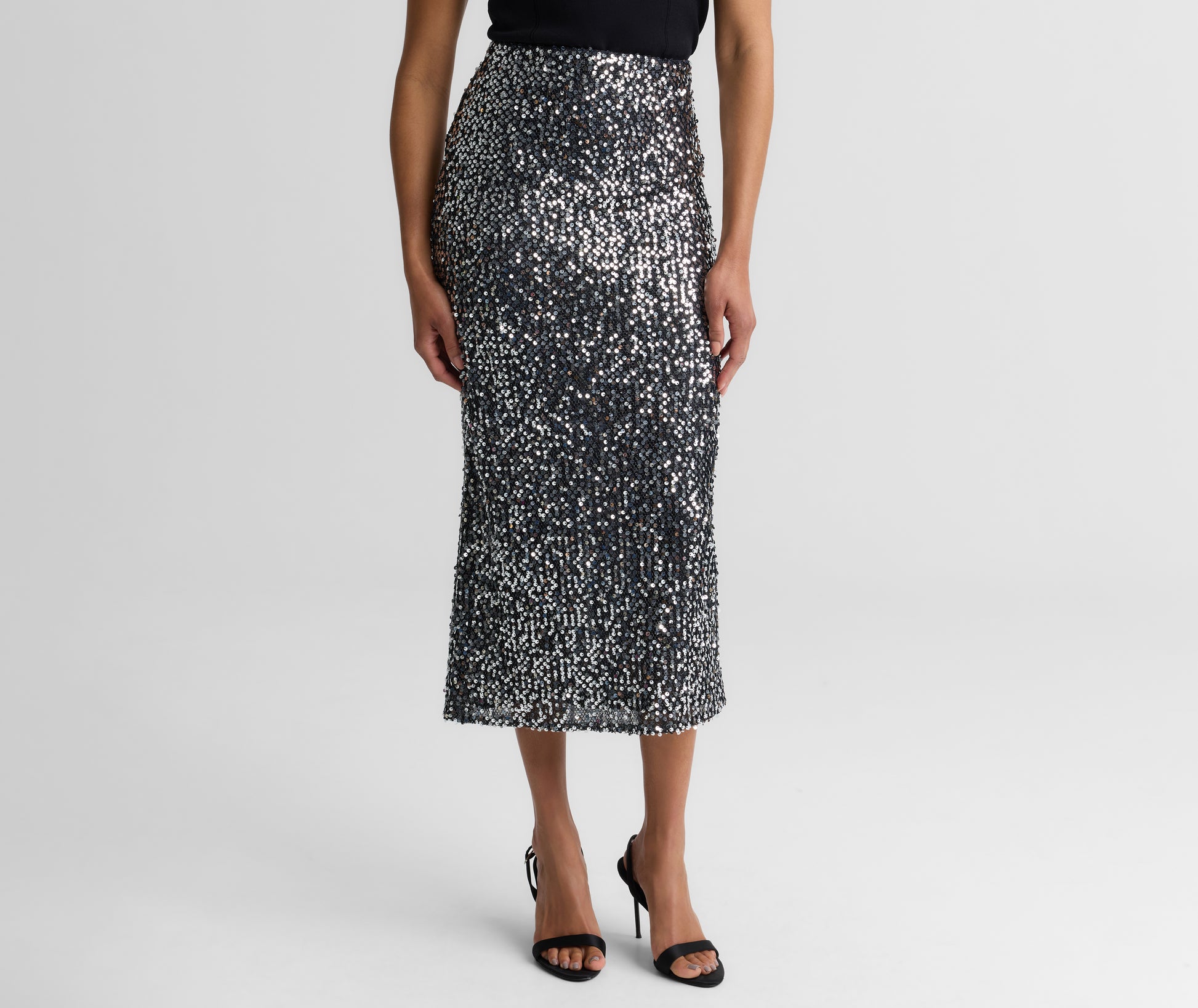 Light up the night in this luminous midi skirt that captivates with paillette-embellished mesh. Paired with polished separates—from softly draped blouses to cashmere cardigans—the Stevie offers unexpectedly chic approach to evening wear.