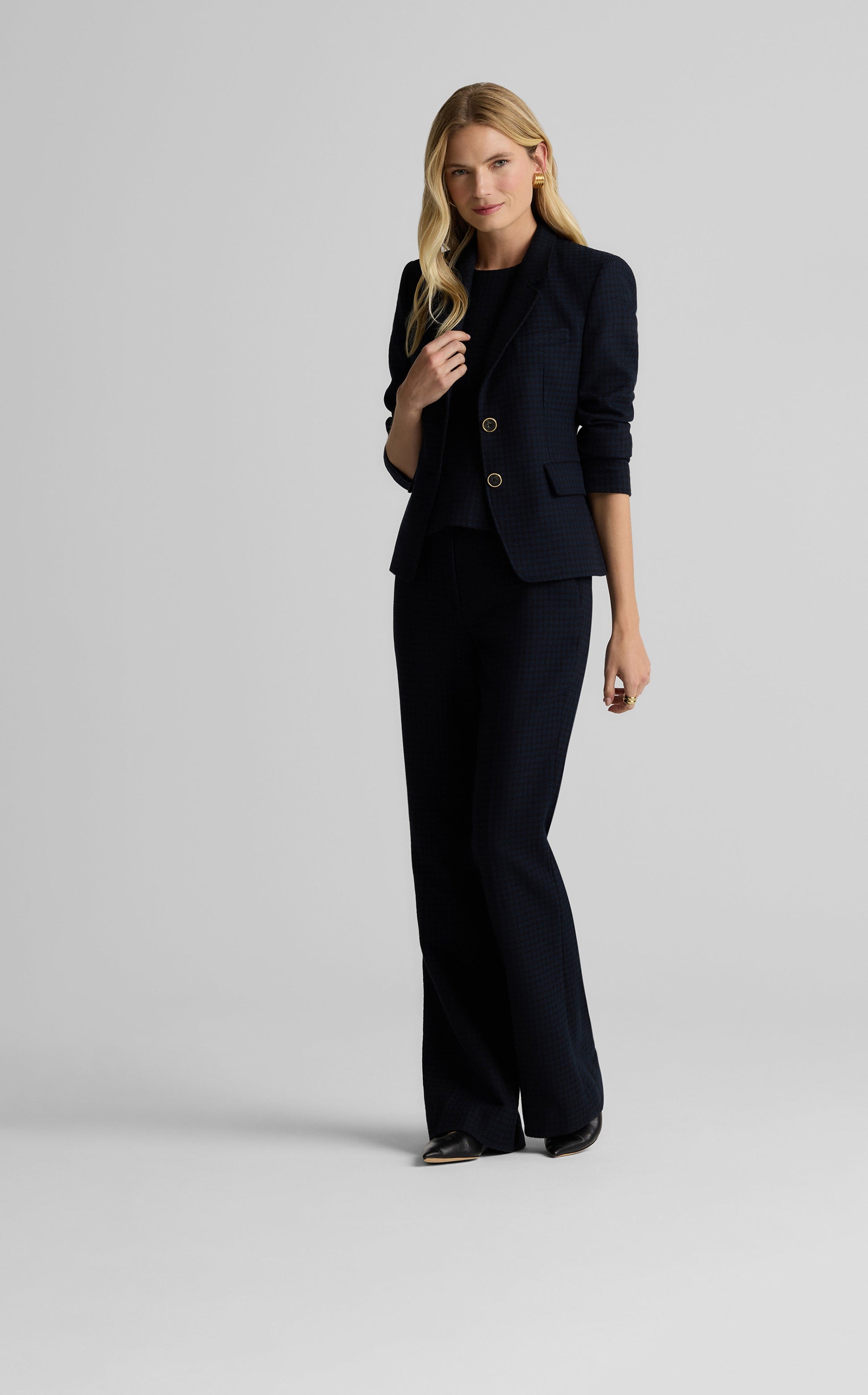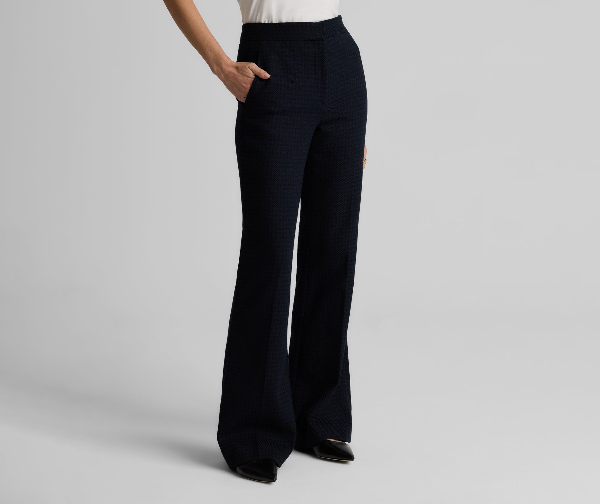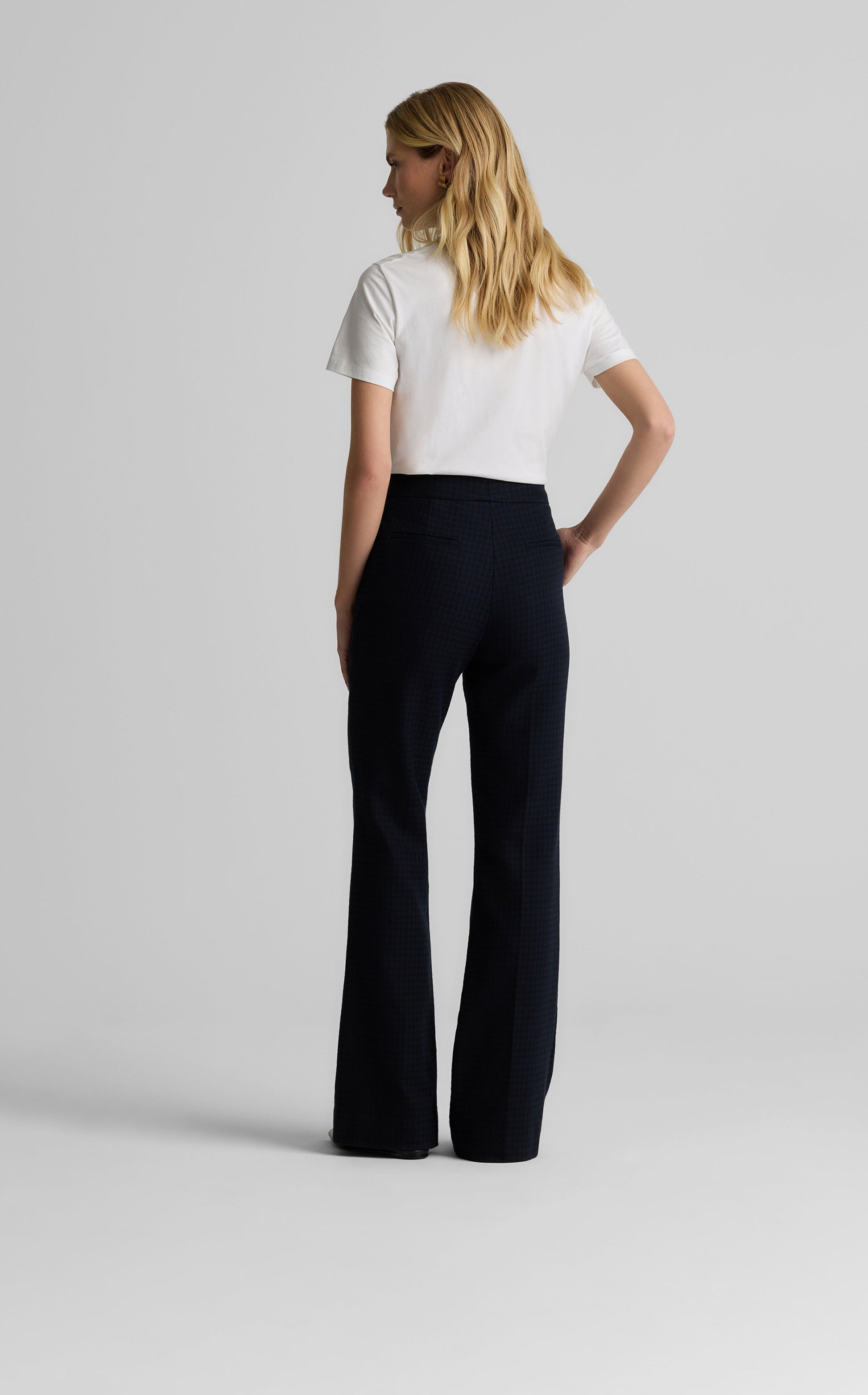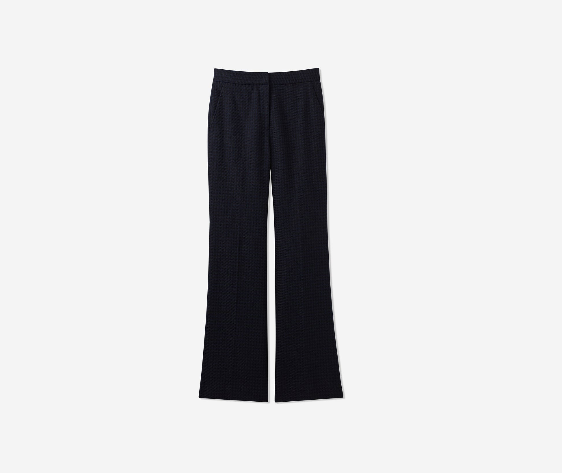 Heritage houndstooth gets a modern twist with the Logan Pant in a timeless Black/Navy palette. Made from a comfortable stretch fabric for effortless, all-day wear and designed with a clean waistband, slash pockets, and a slightly flared leg to create a crisp look, these flattering trousers can be mixed and matched with solid separates to let the pattern pop, or worn with our Parker Jacket or Sloane top for the ultimate coordination.