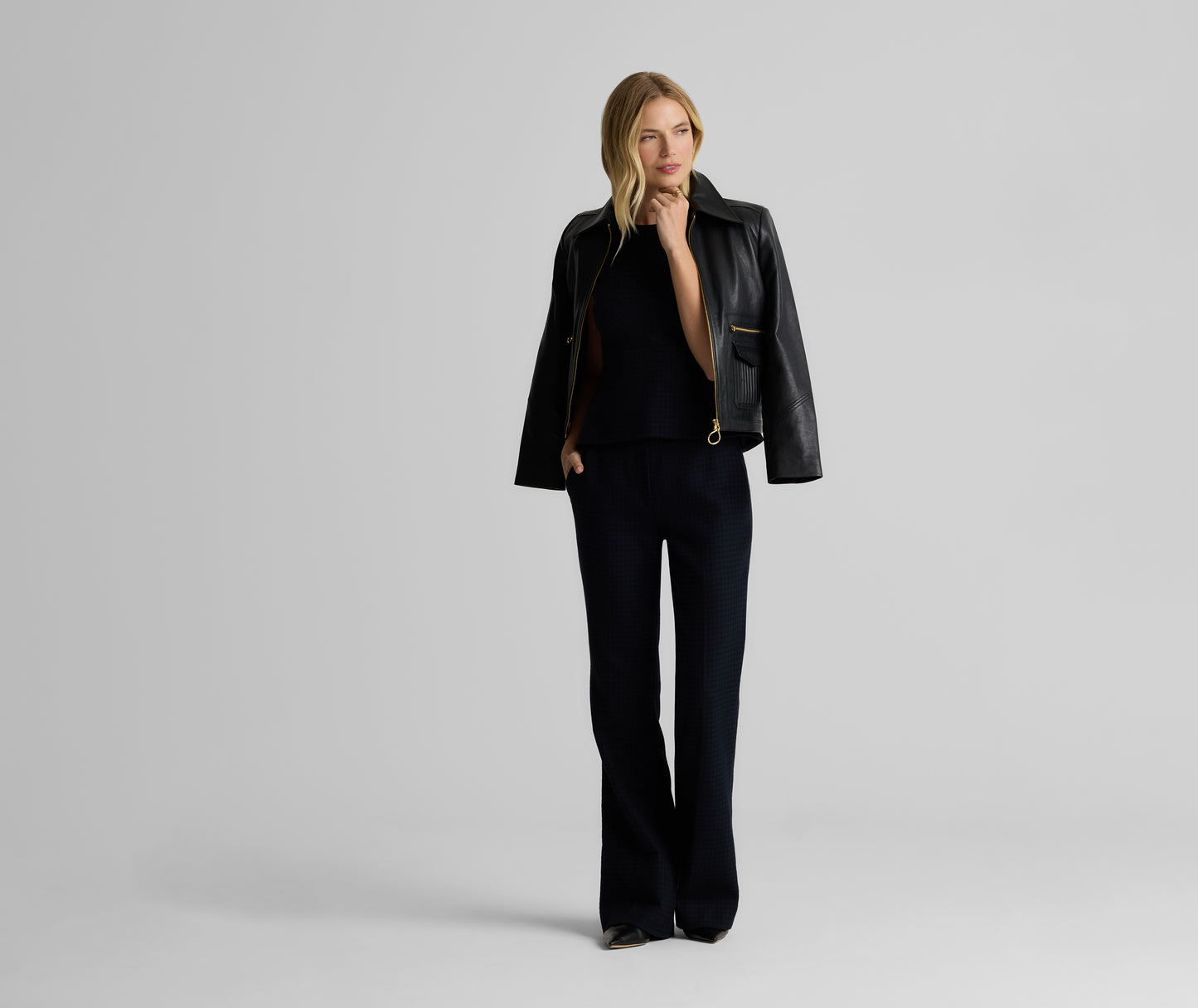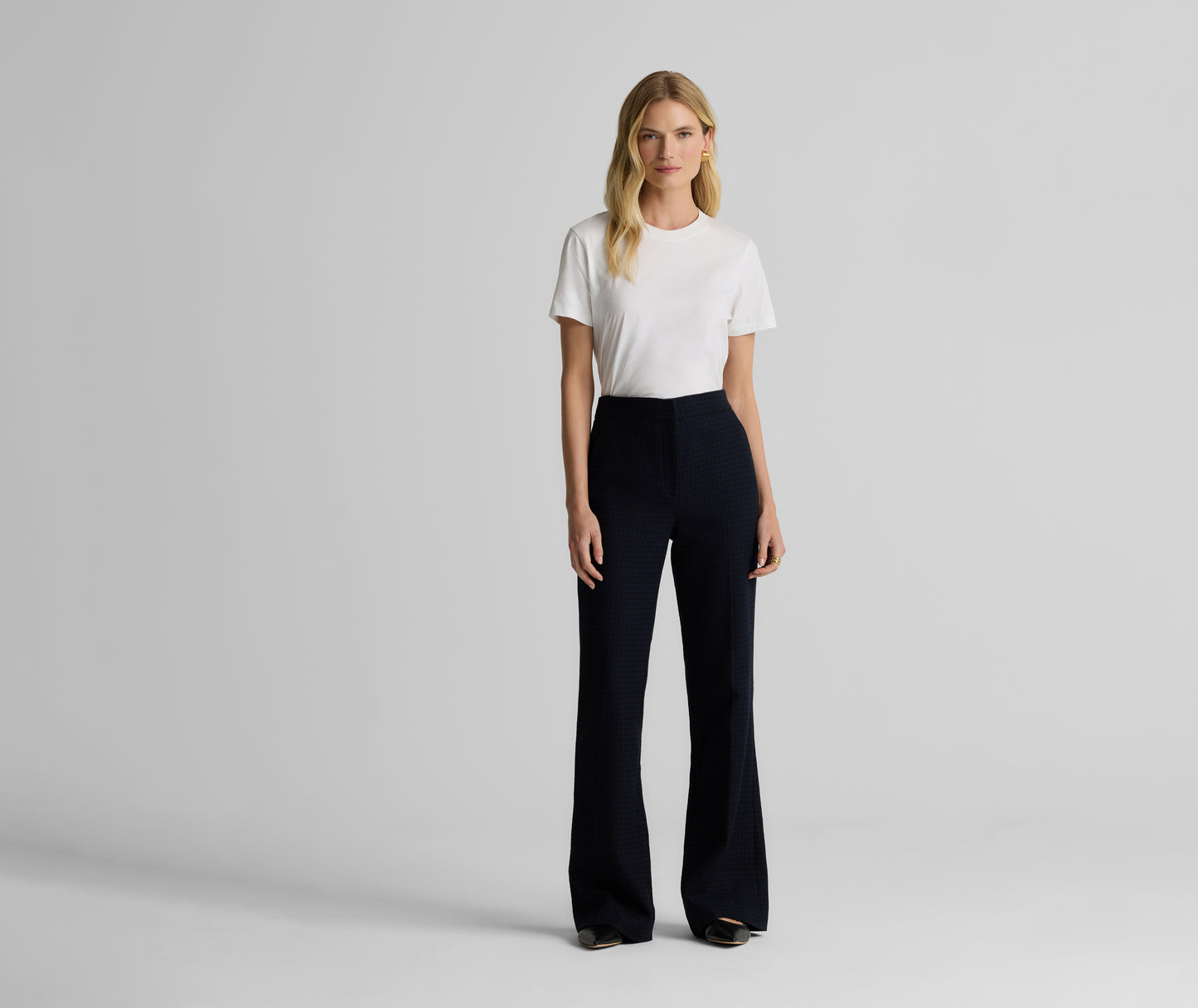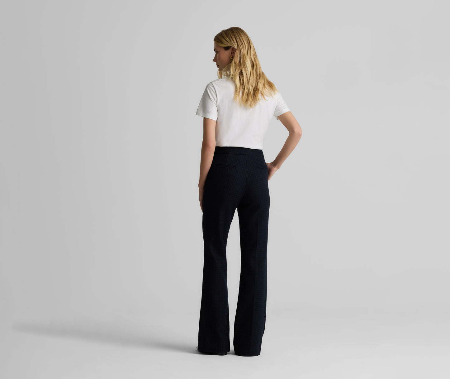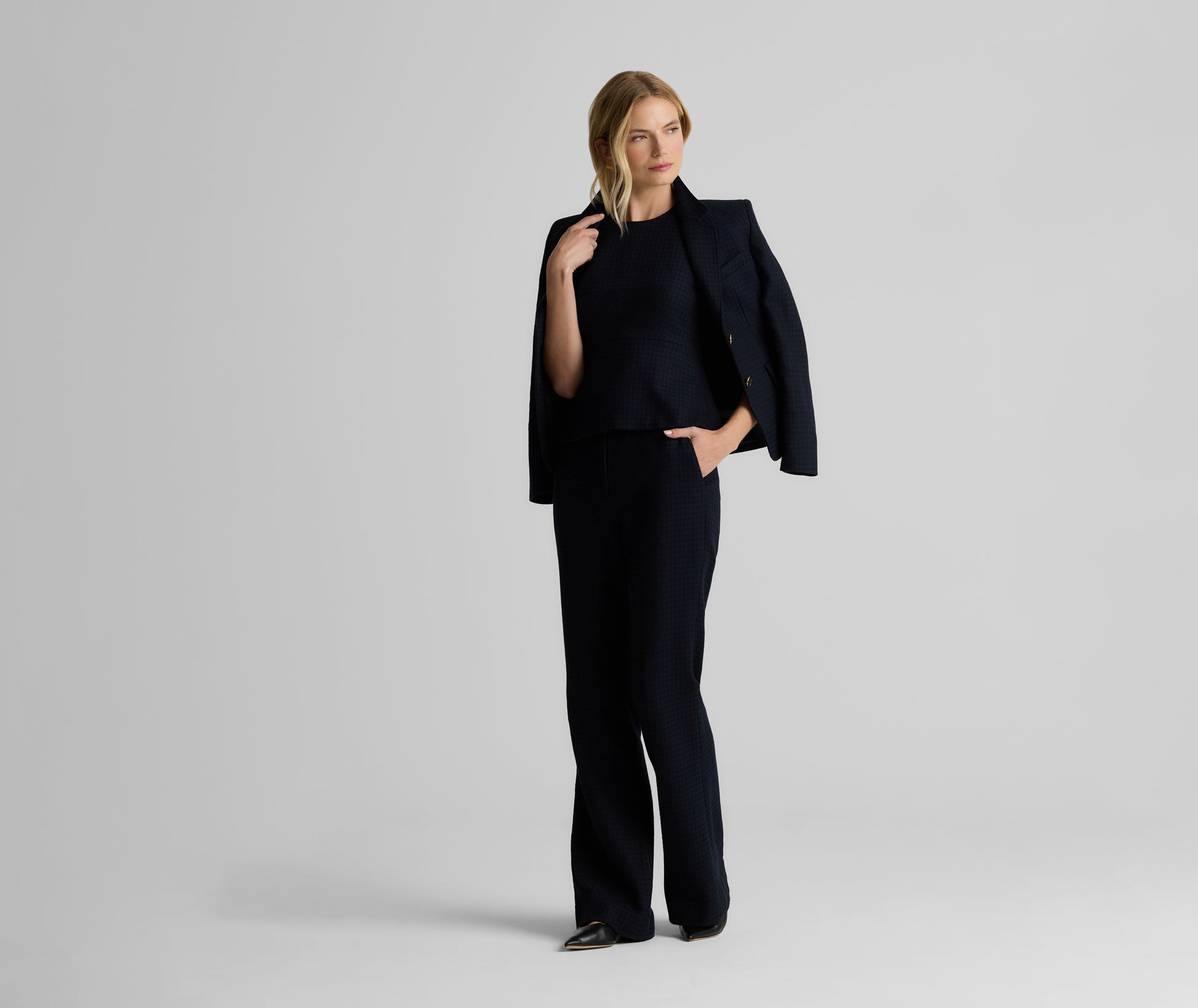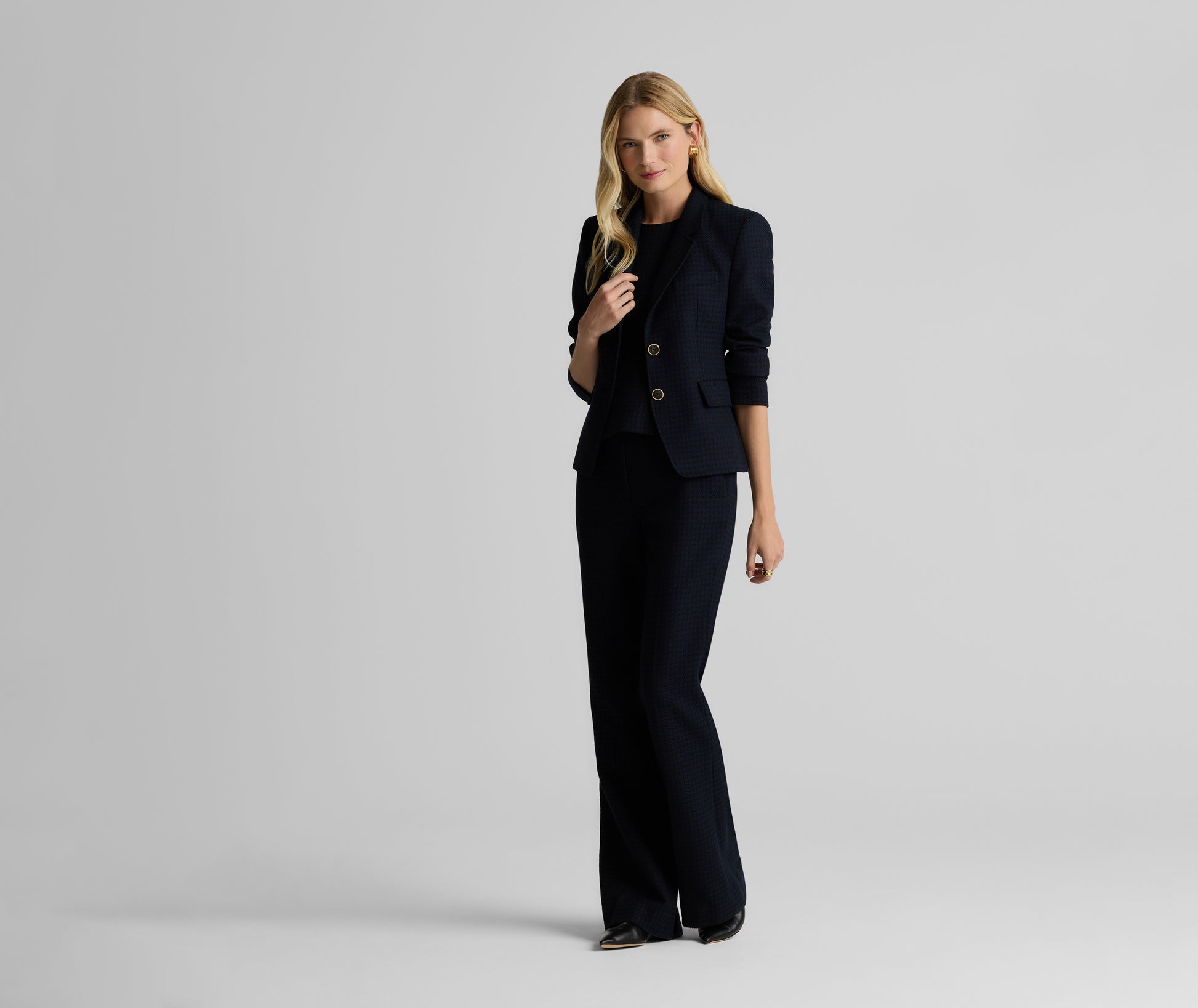 Heritage houndstooth gets a modern twist with the Logan Pant in a timeless Black/Navy palette. Made from a comfortable stretch fabric for effortless, all-day wear and designed with a clean waistband, slash pockets, and a slightly flared leg to create a crisp look, these flattering trousers can be mixed and matched with solid separates to let the pattern pop, or worn with our Parker Jacket or Sloane top for the ultimate coordination.