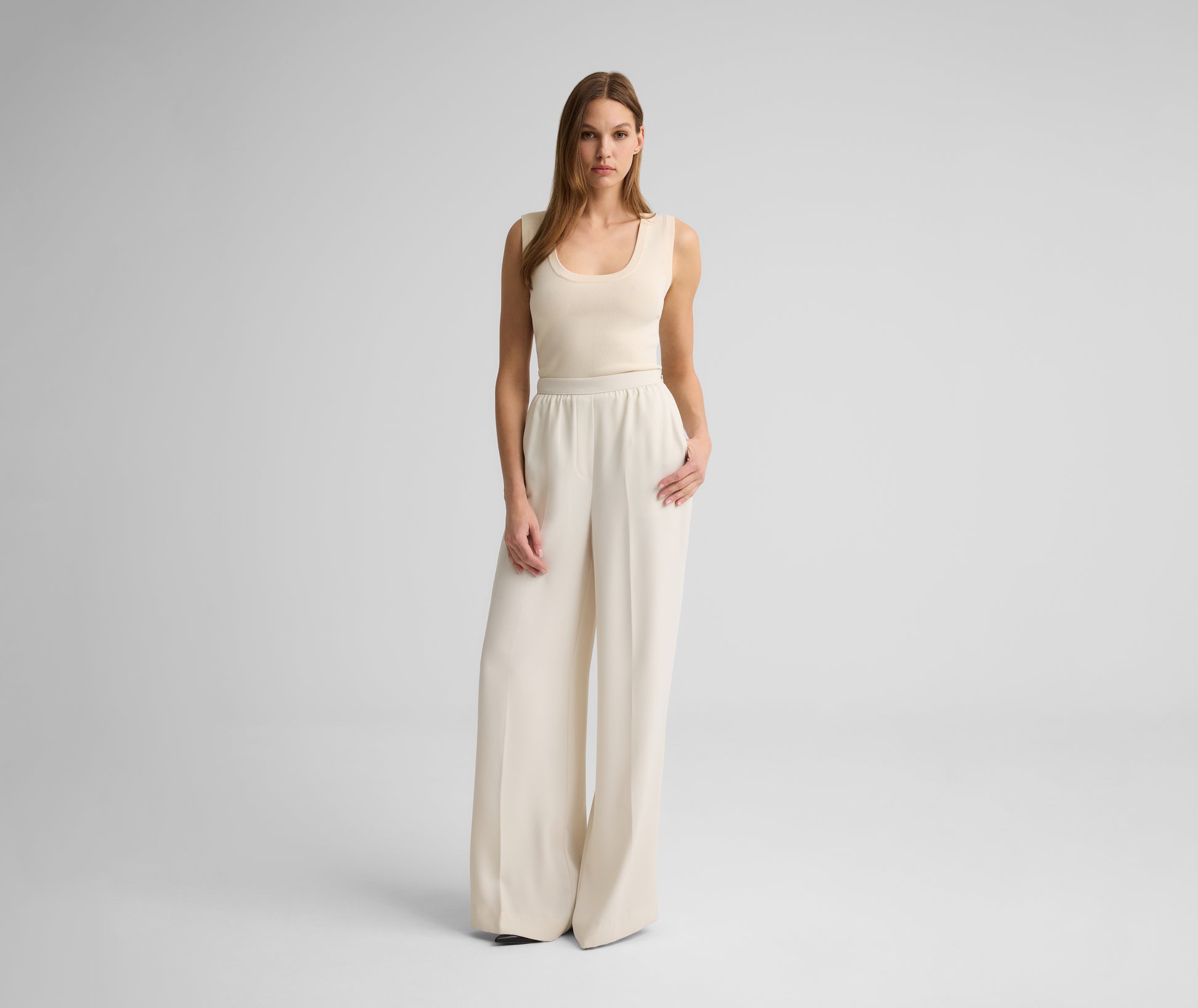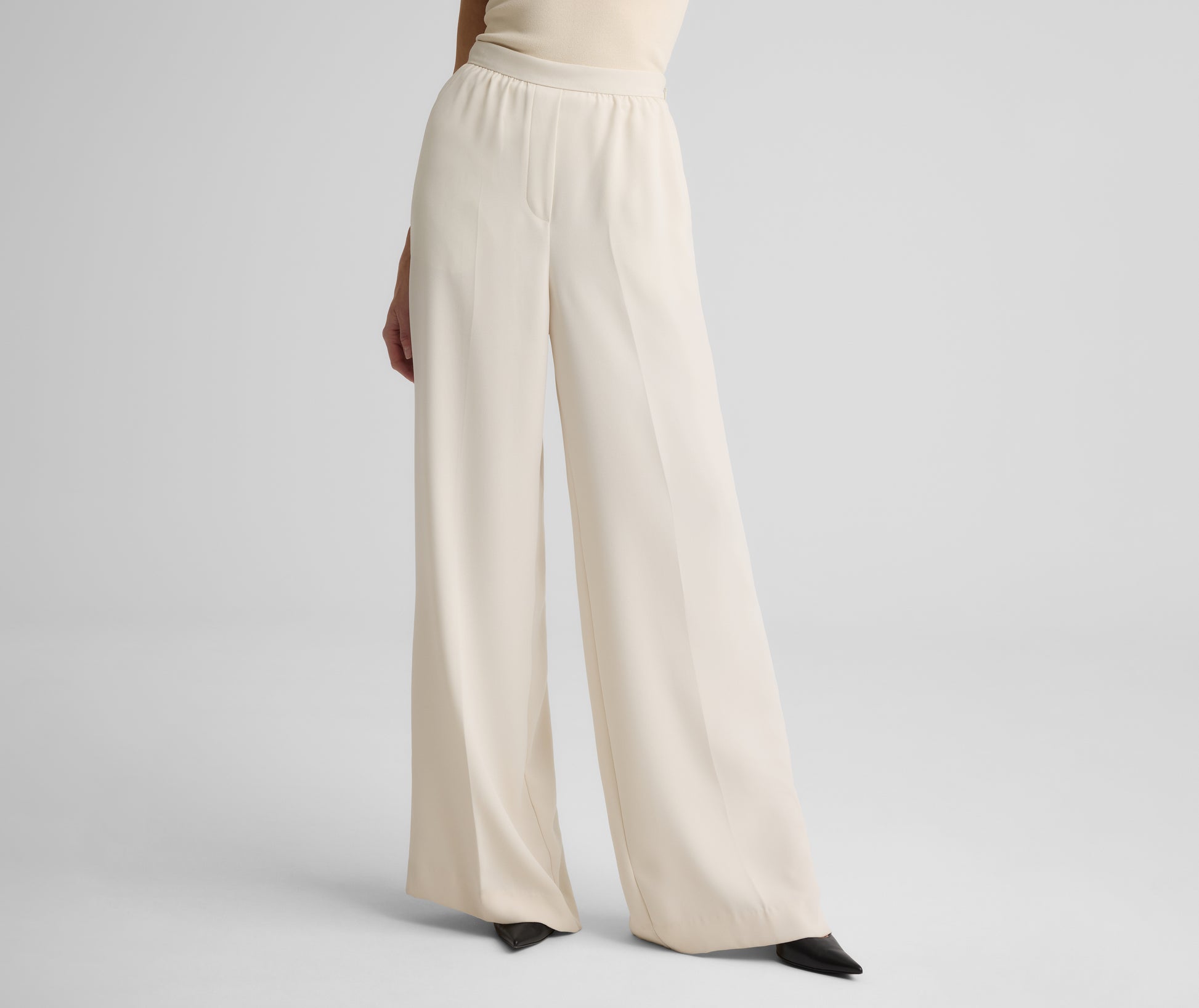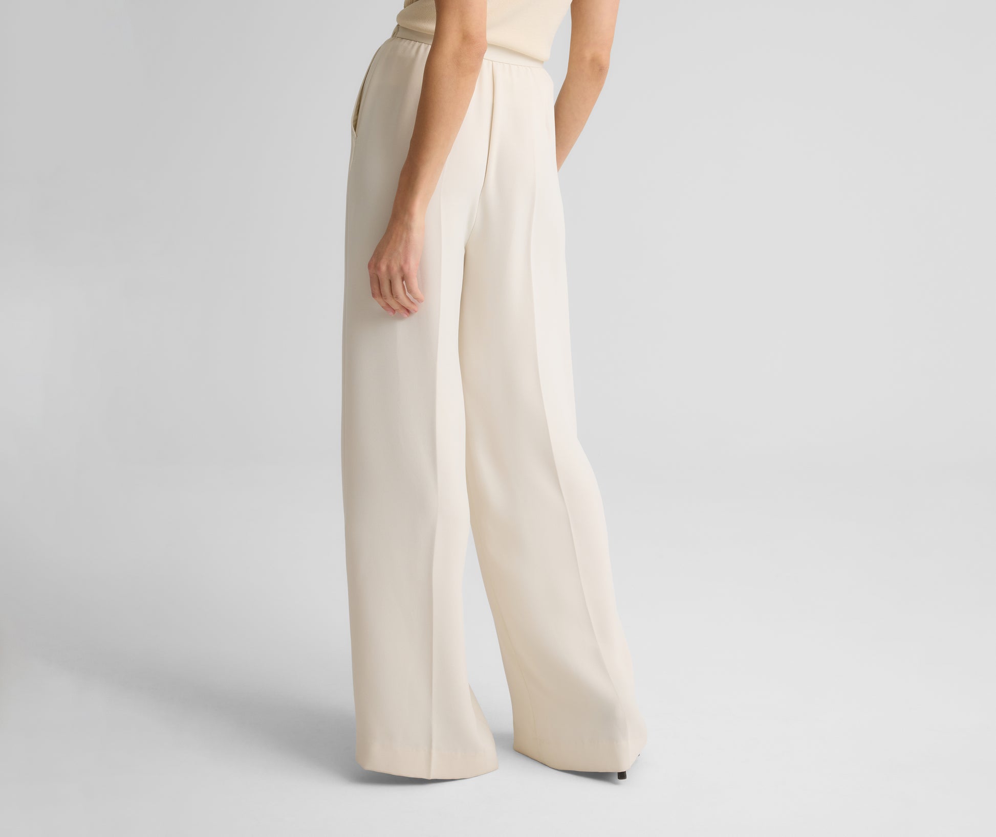 Cut from fluid Satin Back Crepe in classic Ecru, the Tabitha floats through any room with both elegance and ease. The generous wide leg allows for graceful movement, adding an effortless touch to traditional evening wear whether paired with formal jackets, billowy blouses, or embellished tops.
