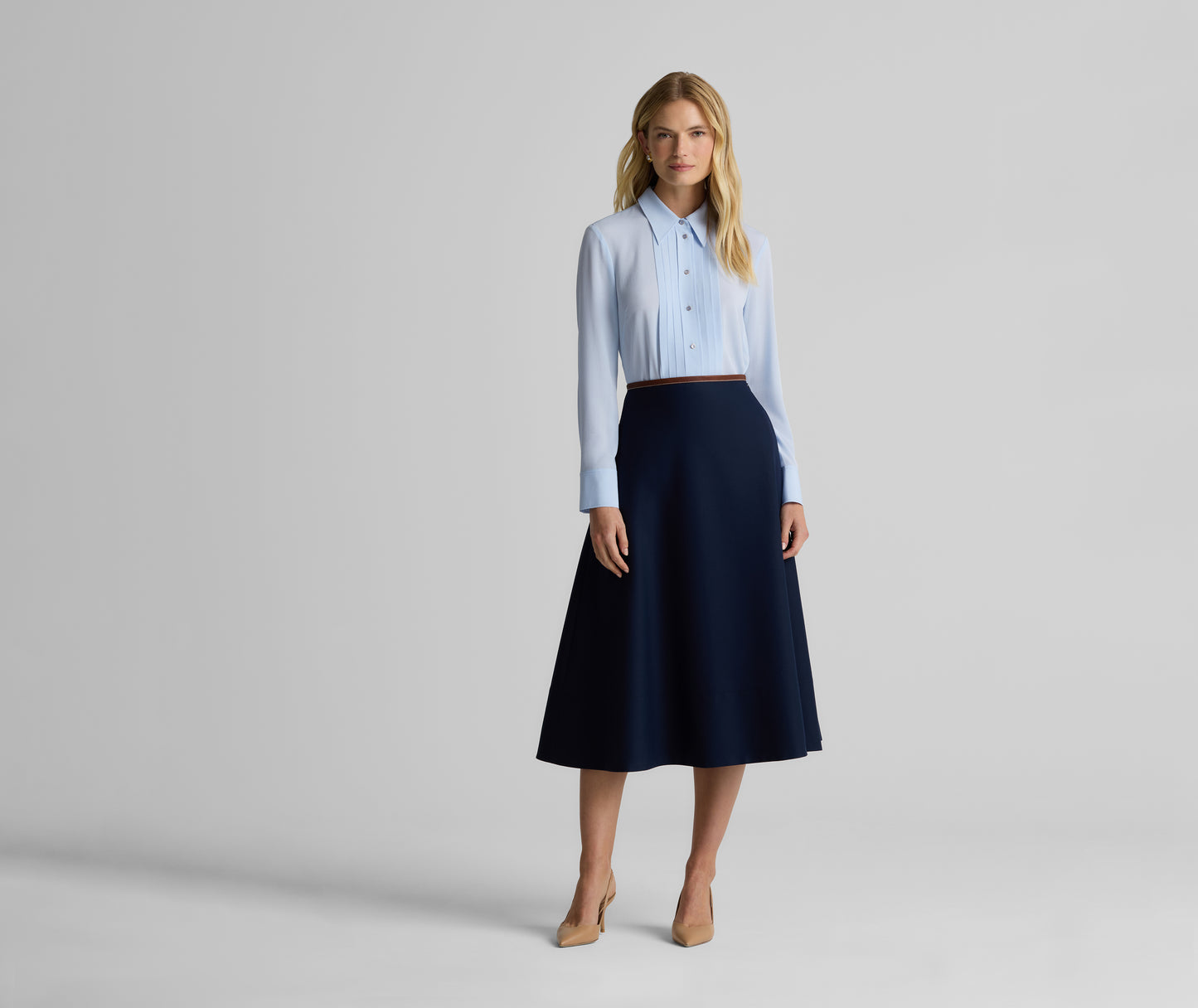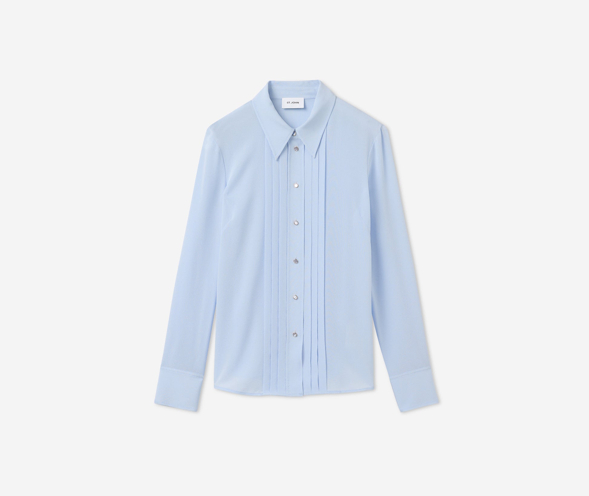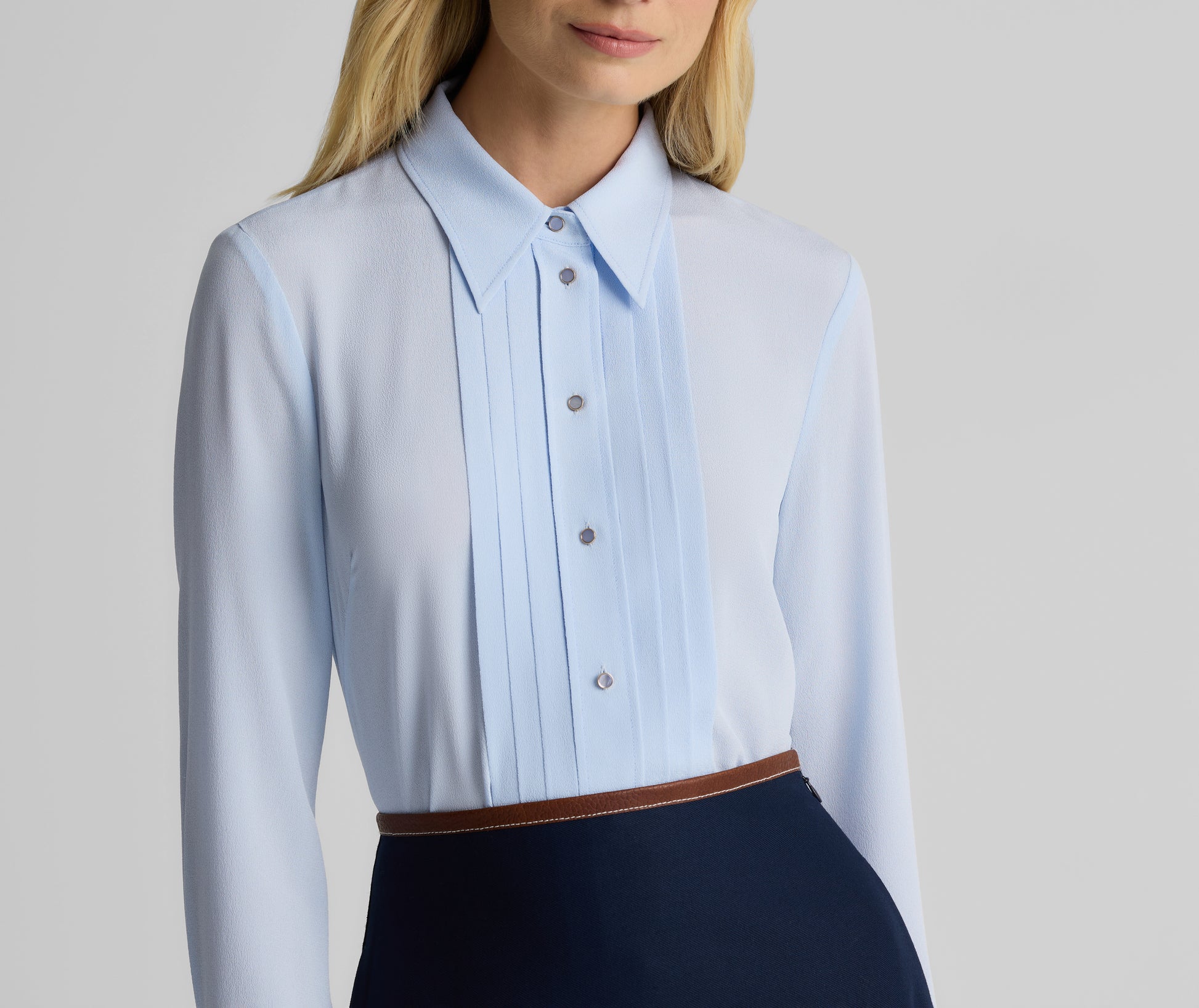 Cut from fluid silk crepe in serene Blue Lagoon, this delicately draped blouse features refined pleated detailing for an elevated silhouette. A convertible collar and cuffed sleeves add versatile elegance, making it a timeless choice for both polished and relaxed styling while the gold rimmed buttons add a touch of luxury.