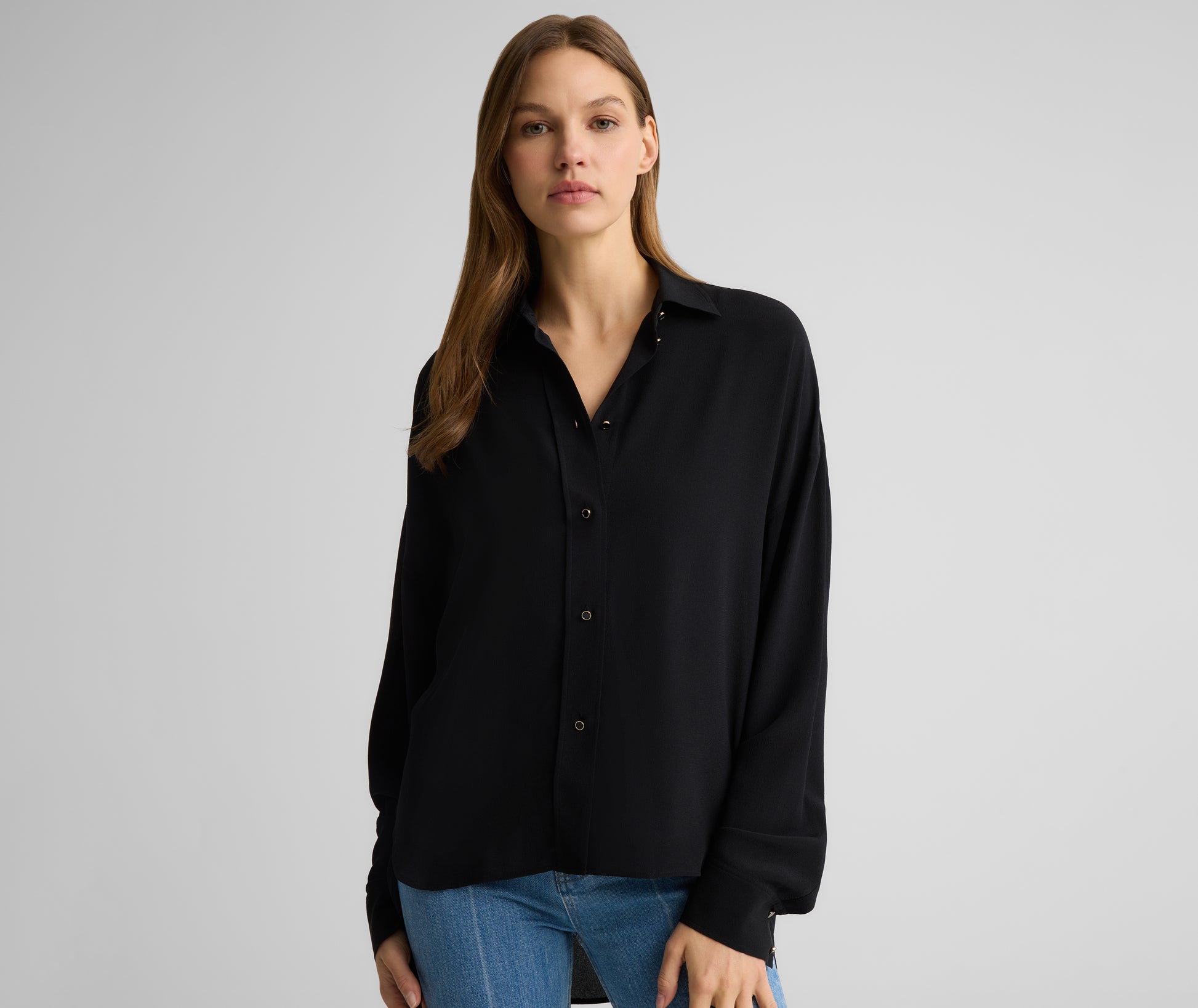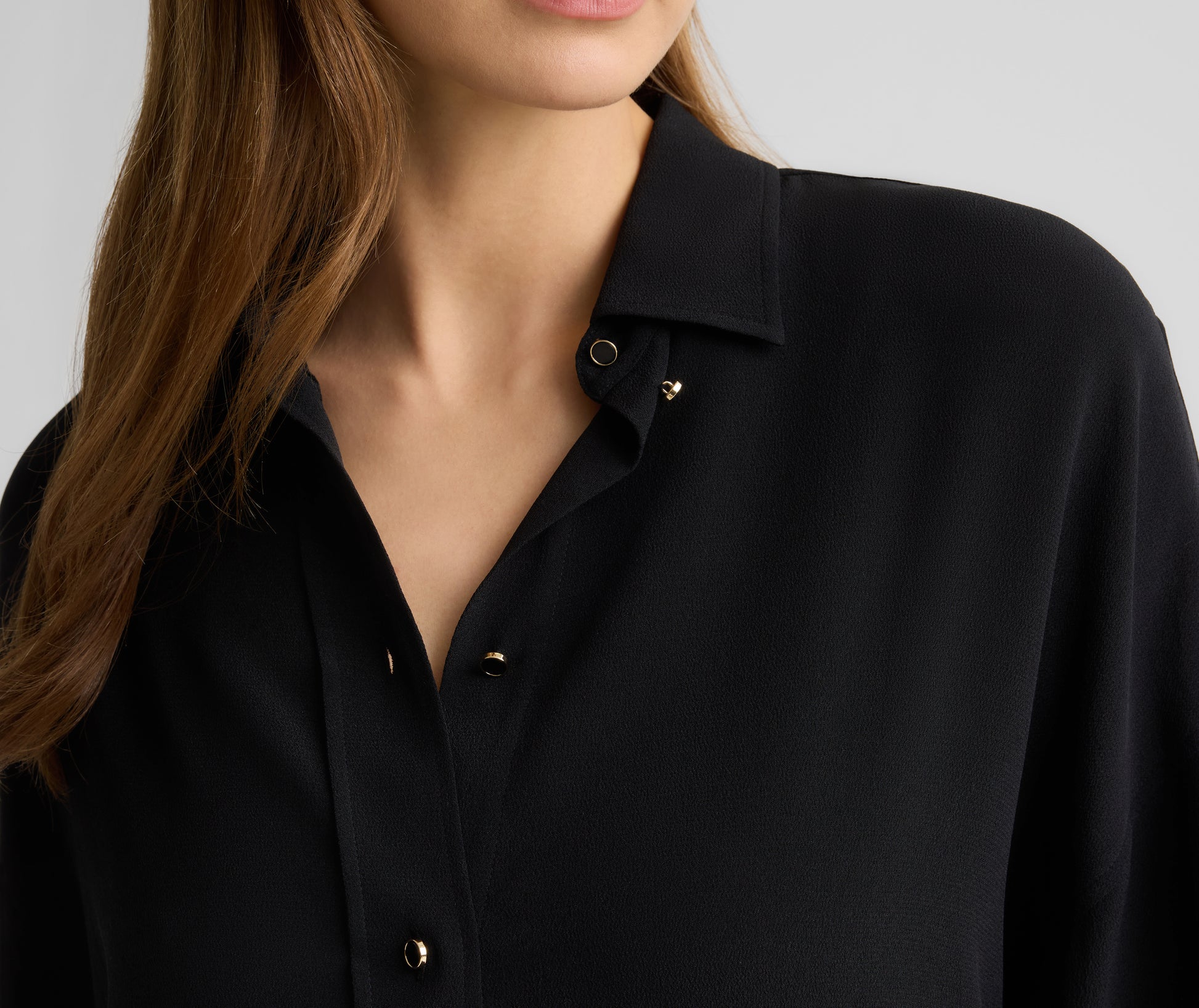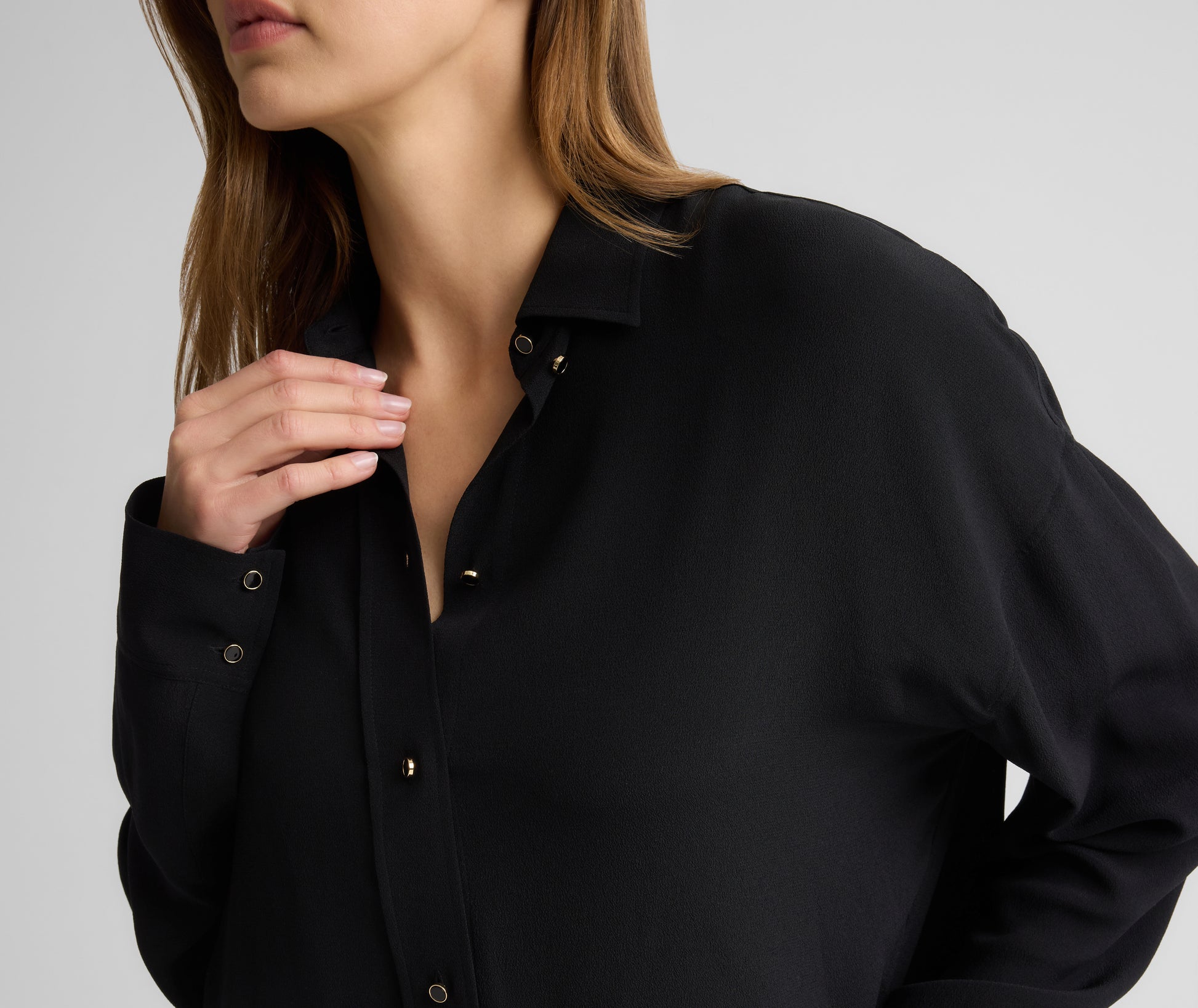 Equal parts relaxed and romantic, the Sharon elevates the classic button down with signature sophisticated details. Cut from fluid silk crepe in serene Rose Quartz, this airy, softly draped blouse is accented with gold-rimmed buttons for an added element of luxury.