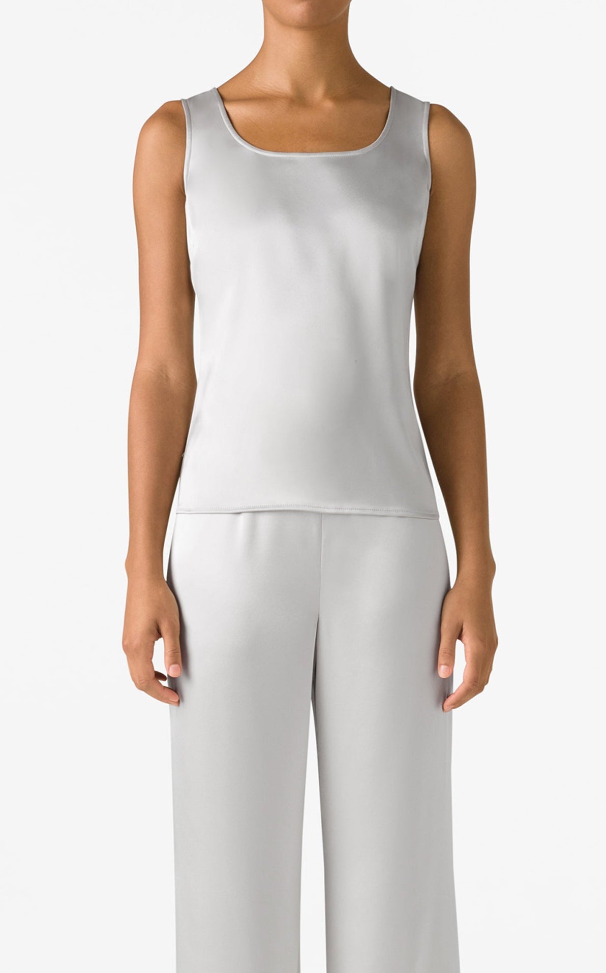 An exquisite choice for office to evening elegance, the liquid satin tank features a sleek silhouette and versatile ease. Whether paired with the St. John Liquid Satin Pant or a Skirt, this tank offers a polished finish.